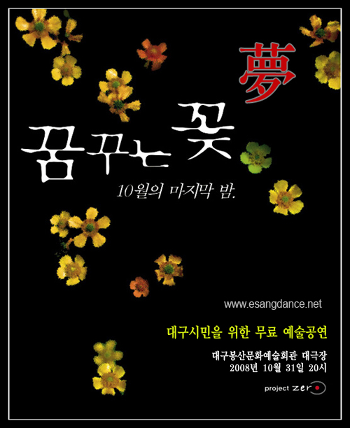 [ °³ ¿ä ] ¡Û ÀÏ ½Ã : 2008³â 10¿ù 31ÀÏ(±Ý) / Àú³á 8½Ã ¡Û Àå ¼Ò : ´ë±¸ ºÀ»ê¹®Èȸ°ü ´ë±ØÀå ¡Û ÁÖ ÃÖ : ÀÌ»óÄ¿¹Â´ÏÄÉÀÌ¼Ç ¡Û ÁÖ °ü : ÀÌ»ó_È ¹«¿ë´Ü ¡Û ±â ȹ : project ZERO ¡Û È« º¸ : ¾Æ¸§´Ù¿î Ãã¼¼»ó ( www.esangdance.net ) ¡Û ÈÄ ¿ø : ´ë±¸±¤¿ª½Ã, ½ºÆÄ¹ë¸® ¡Û ±¹¾Ç±âÀü½Ã : Çѿ︲±¹¾Ç»ç ¡Û ¹® ÀÇ : 053-652-8082 . 011-538-2402